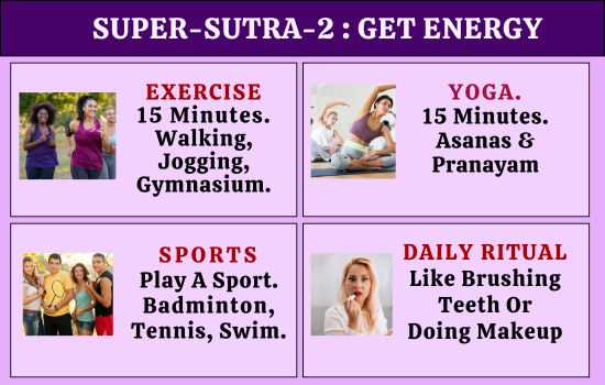 Simple fact is that no energy means no life. Exercise everyday for at least 15 minutes. Walking, Jogging or Gymnasium. Do Yoga for 15 minutes. Play a sport like badminton, tennis or swimming. Make it a habit like brushing teeth or doing makeup.